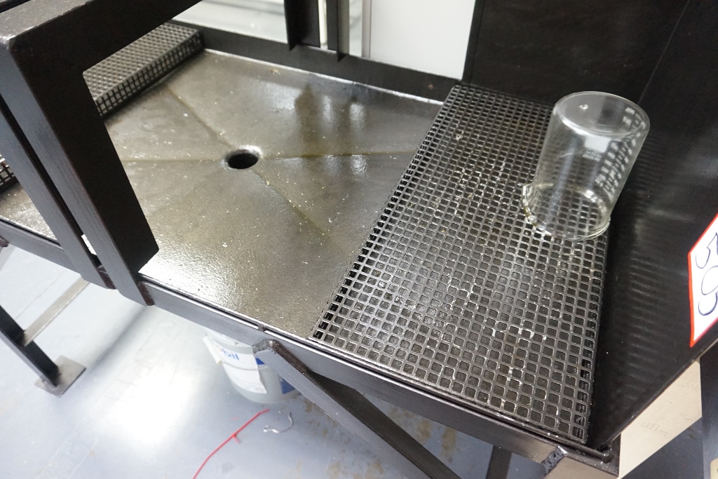 (2) Work Benches (1) 2m x 1.1m (1) 1.5m x 0.85m, Oil Drainage Table 1.23m x 0.61m