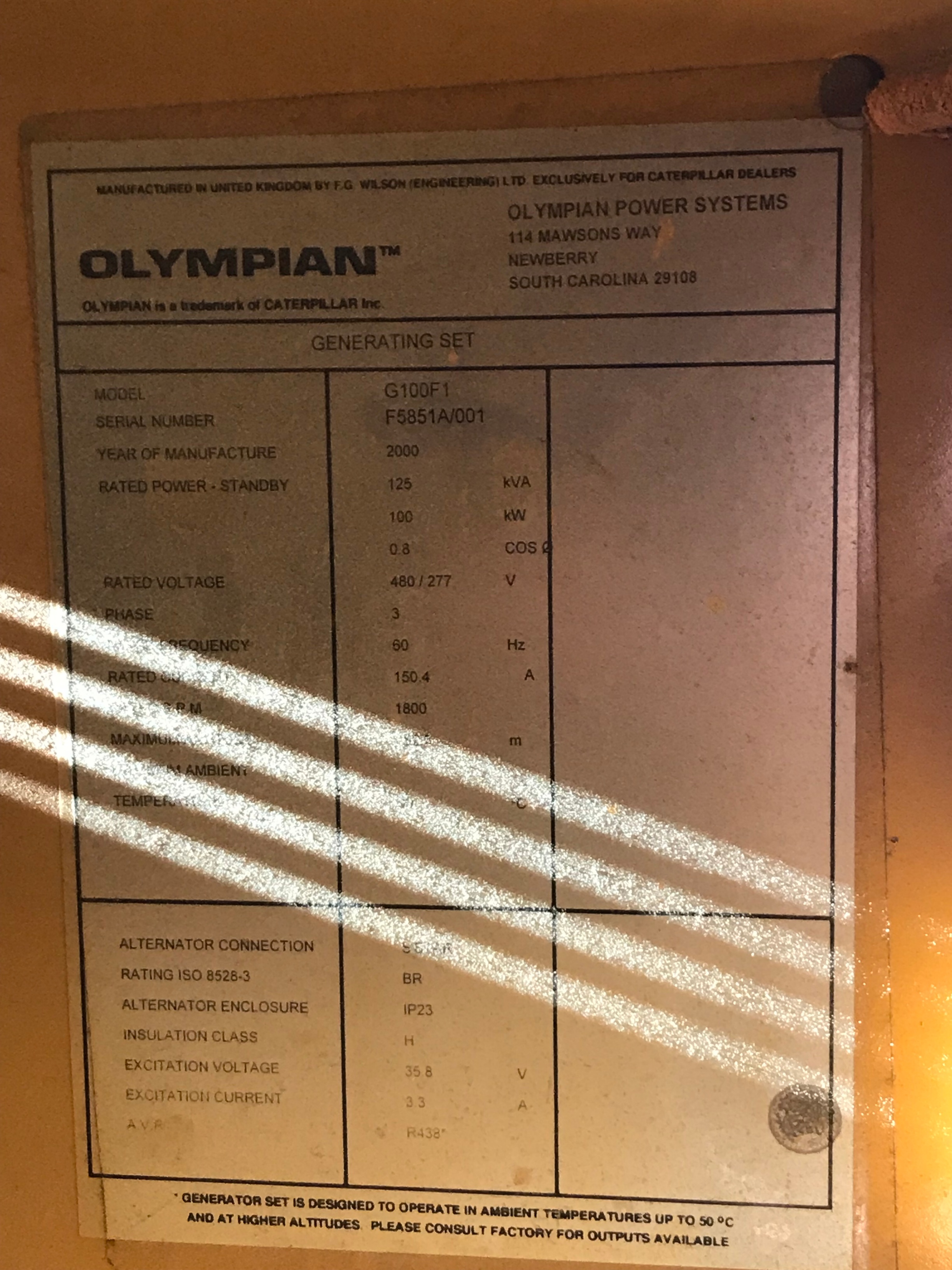 2000 CATERPILLAR G100F1 Natural Gas Generator, s/n F5851A/001, w/ 100 kw, 125 kva