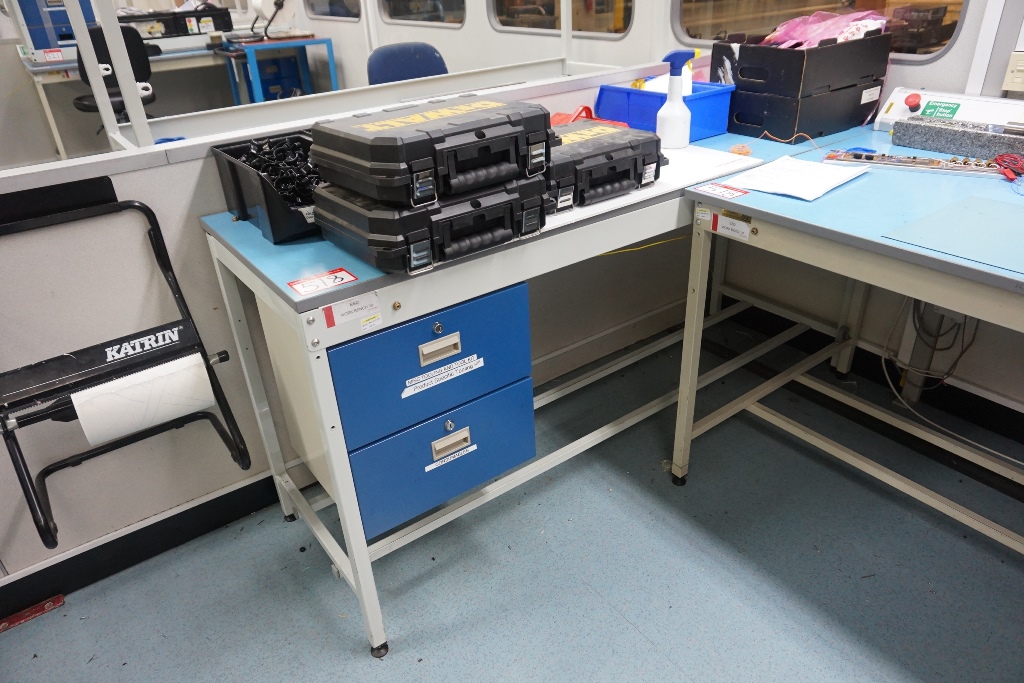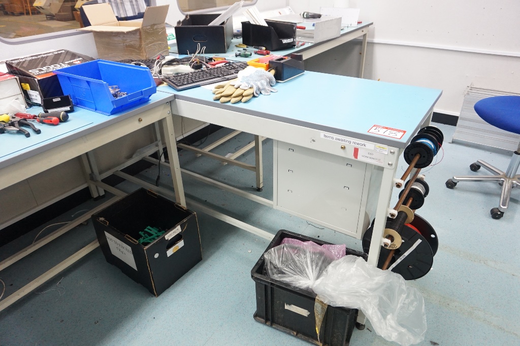 (3) Antistatic Work Benches with Electric Sockets (2) 1.8m x 0.60m (1) with 3 Drawers (1) with 2 Drawers (1) 1.8m x 0.90m