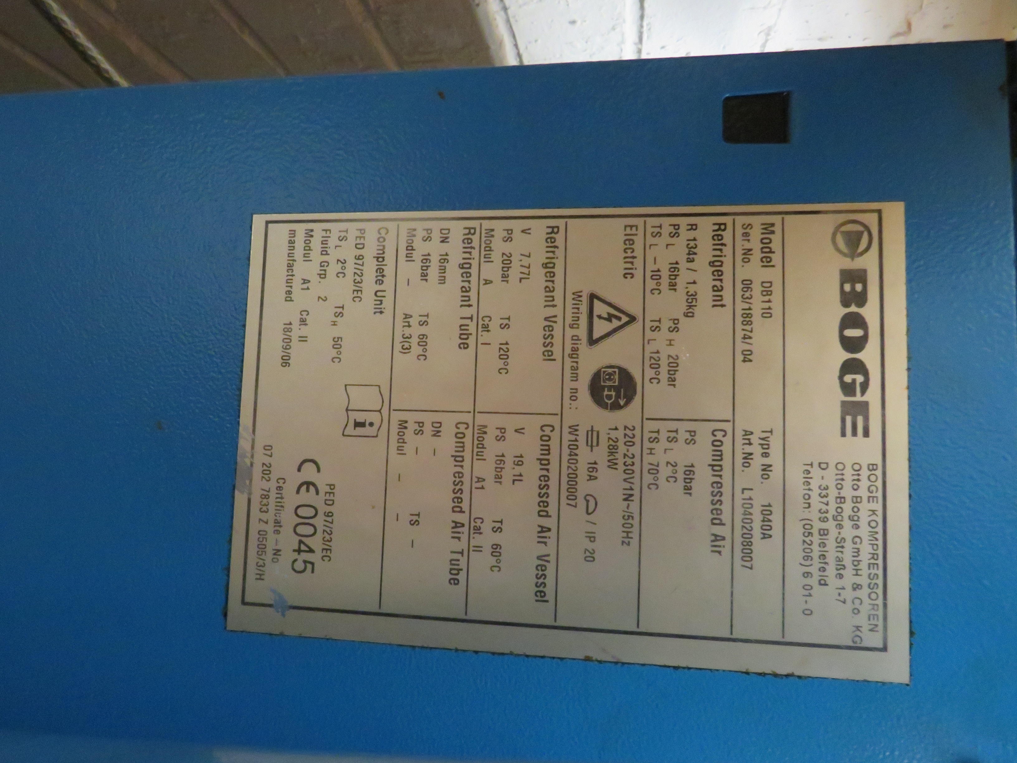 Boge Refrigerant Air Dryer, Mode DM110, Refrigerant Type R134a, Maximum Pressure 16 Bar. Serial No 063/18874/04