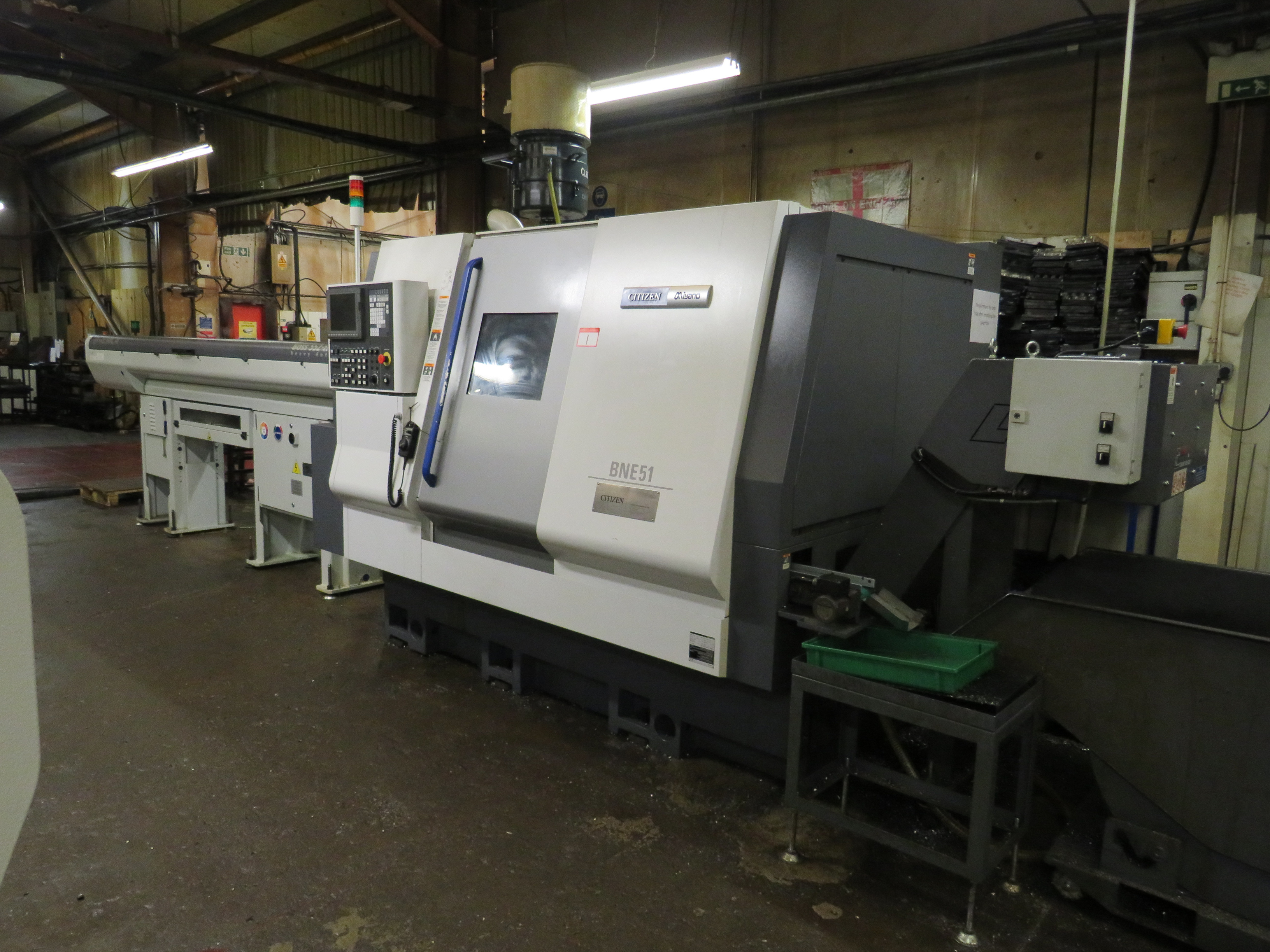 Citizen Miyano BNE51MSY 9-Axis CNC Turning Centre with LNS Swarf Conveyor, Parts Conveyor, Cleanmist CM1000/2 Filtermist, Transformer, Swarf Bin. S/No. DN0110 (02/2018) & IEMCA Boss 552-HD Barfeed. S/No. 0128216A02 (2018)