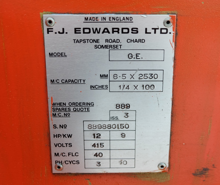 Edwards Truecut Type 6.5/2500 Power Guillotine, Capacity 2530mm x 6.5mm (100" x 1/4"), Power Back Gauge.