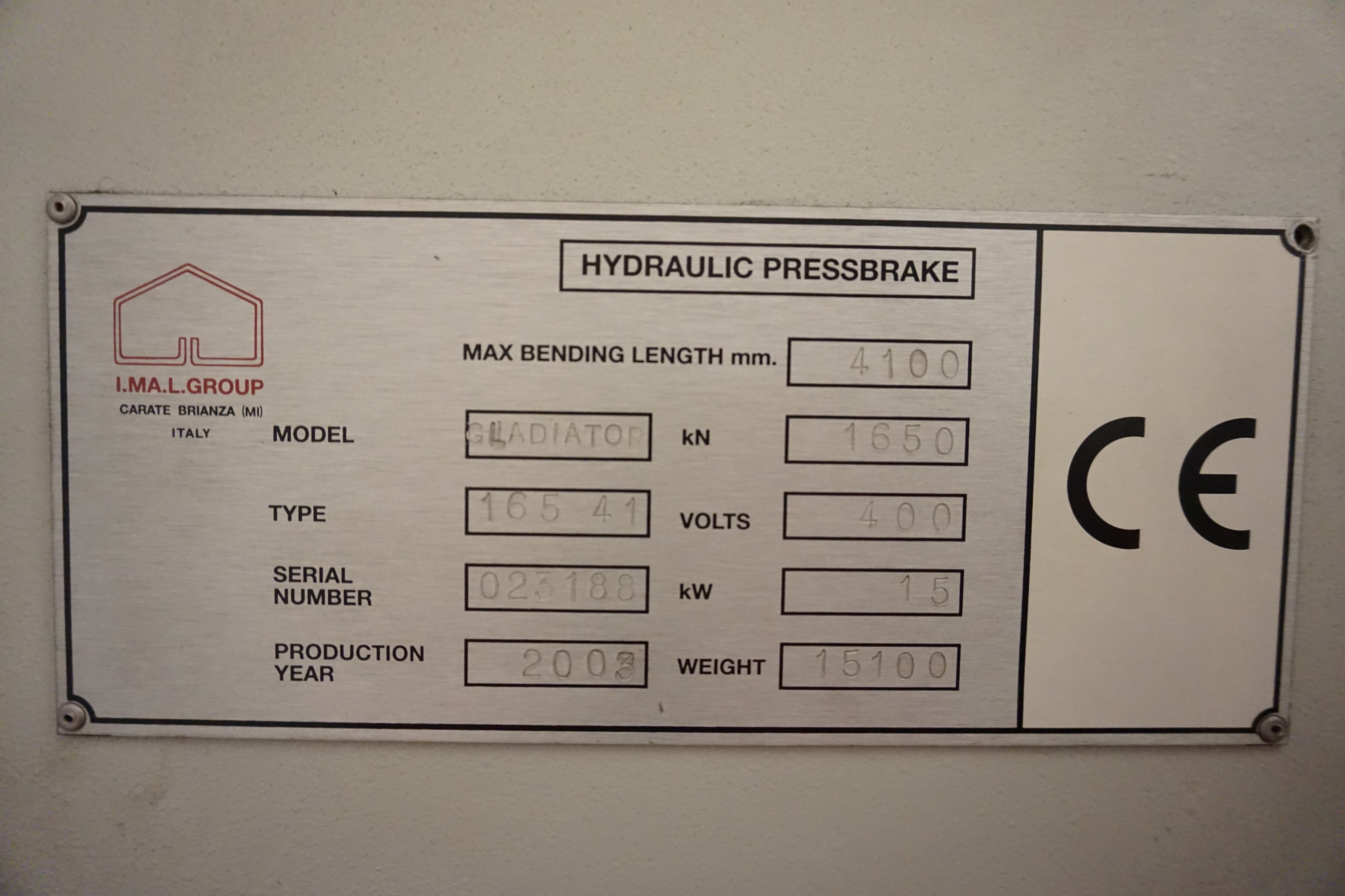 I.M.A.L Group Gladiator 165 Hydraulic Press Brake with Delem Control, Type 16541 with Max Bending Length 4100mm. S/No. 023188 (2003)