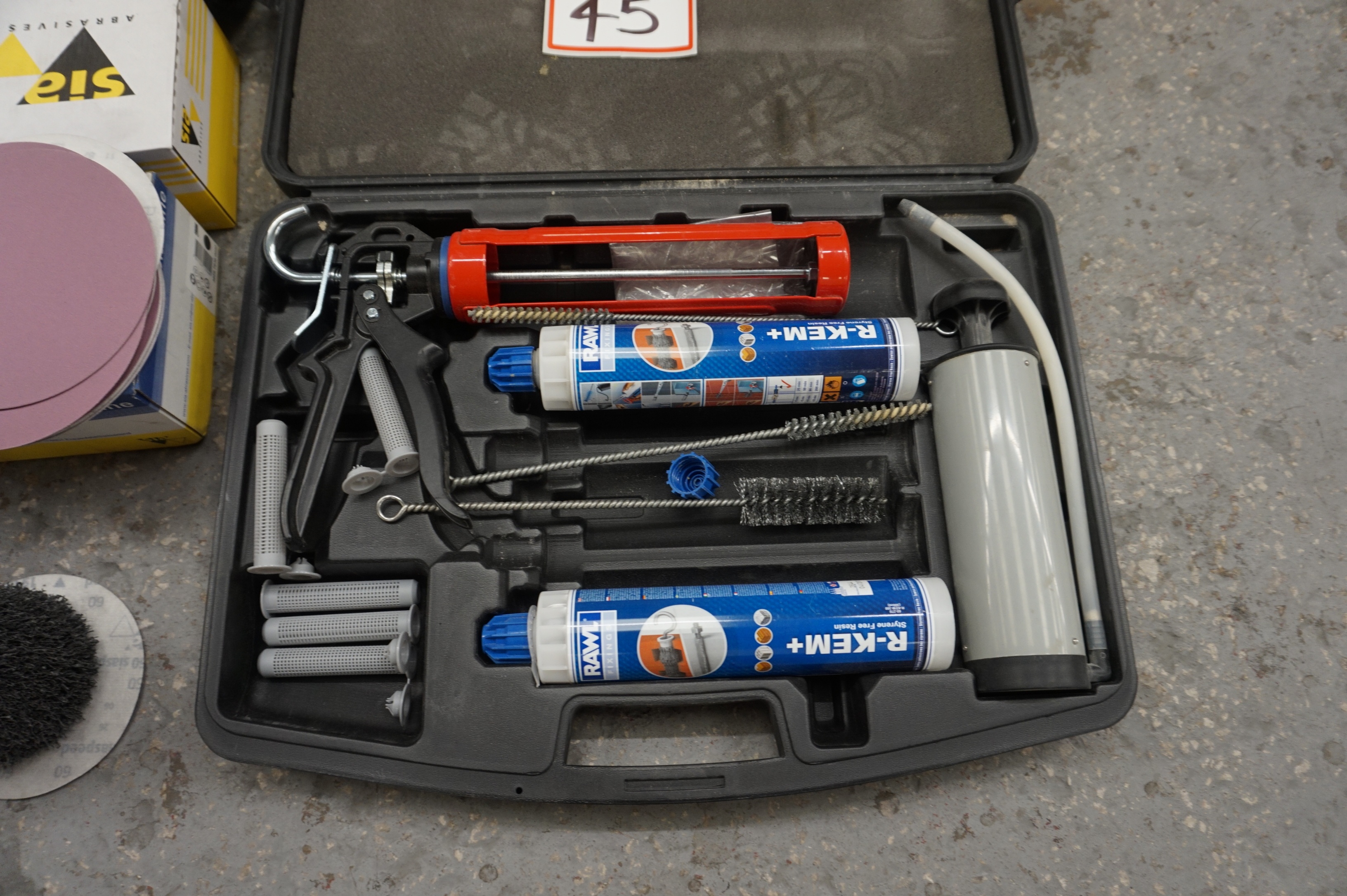 Lot 45: Large Qty of Abrasive Discs, Air Tools, R-Kem Resin Kit