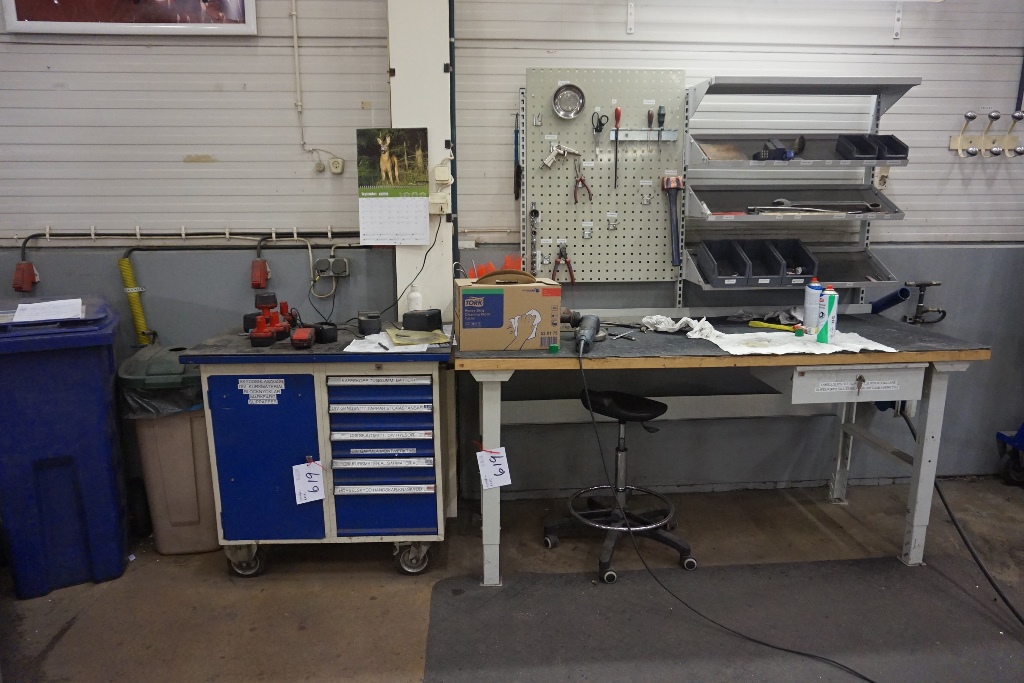 Mobile Trolley with 5 Drawers and Cupboards including Hand Tools, Bench 2m x 800mm with 1 Drawer, Mobile Trolley with Qty of Storage Containers including Helicoils