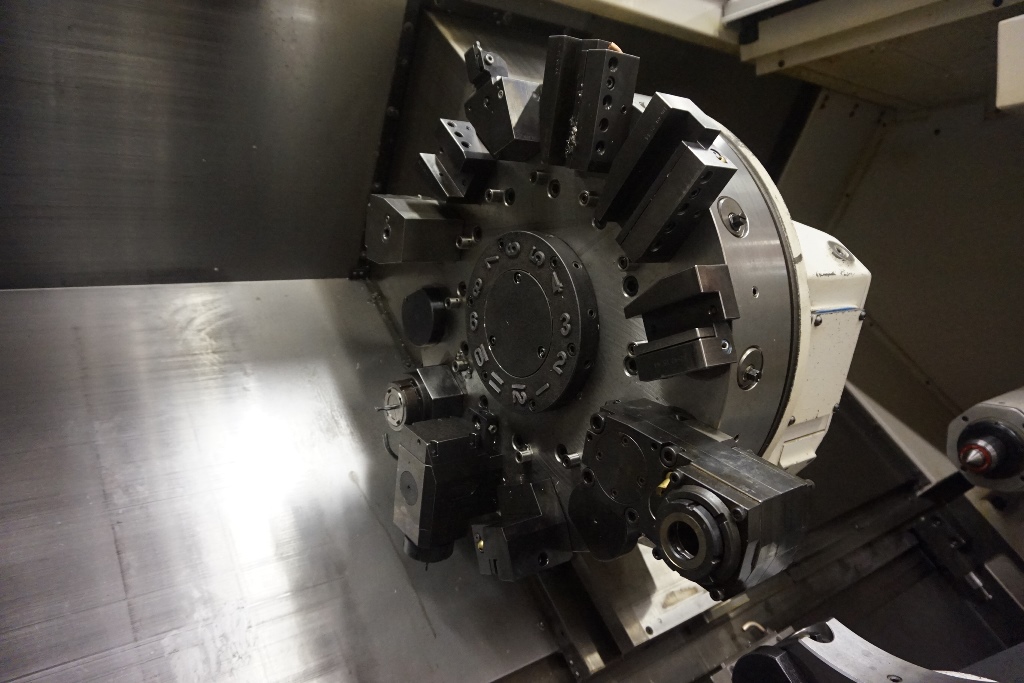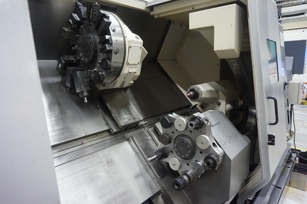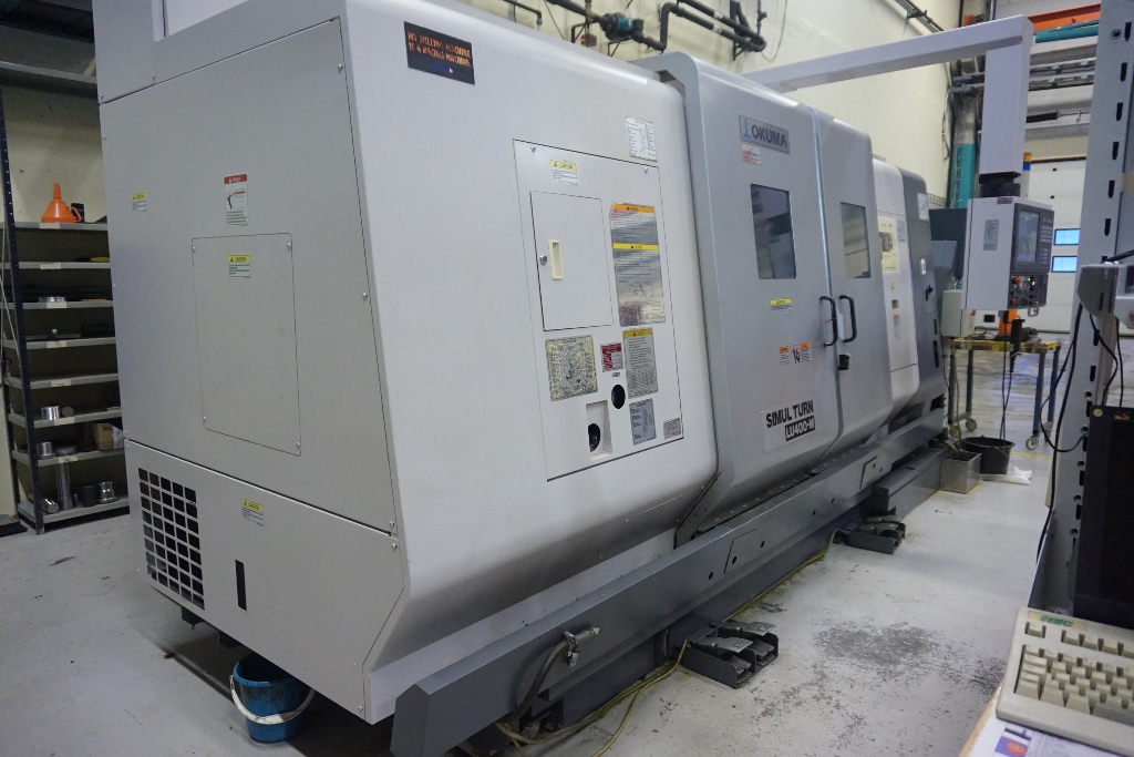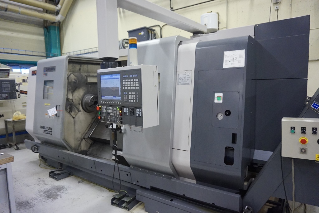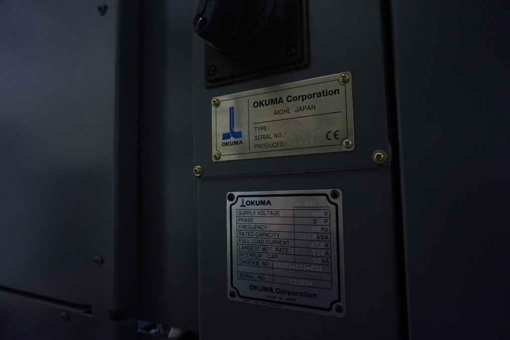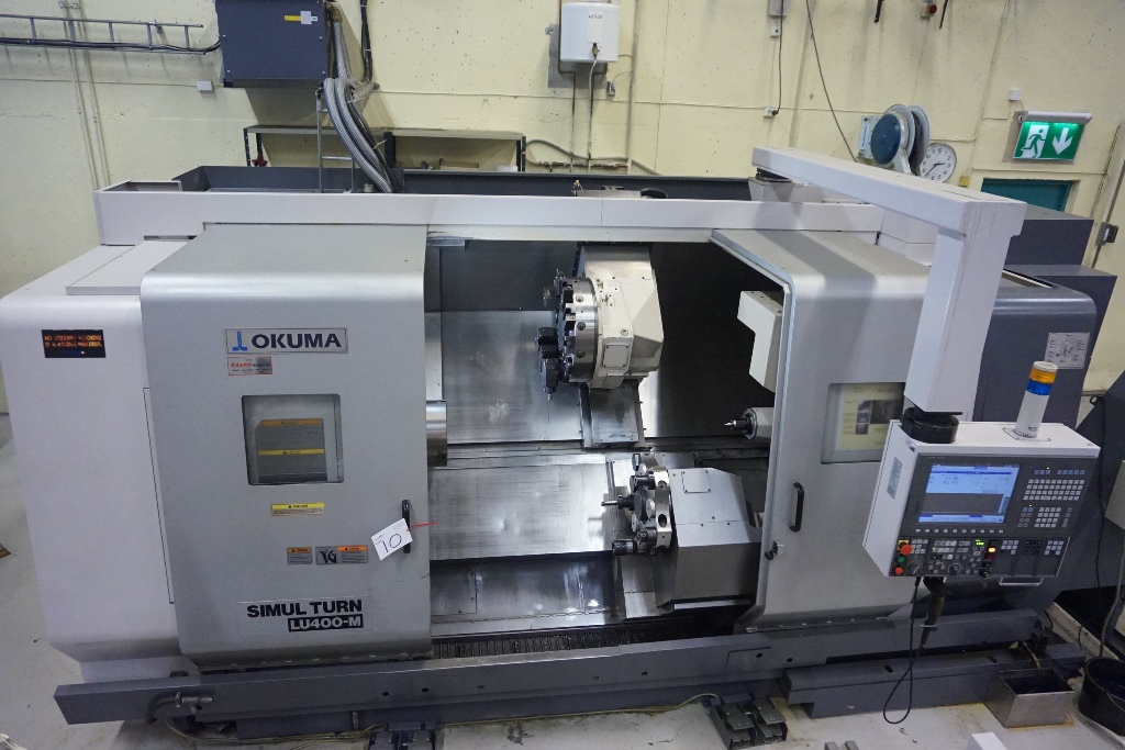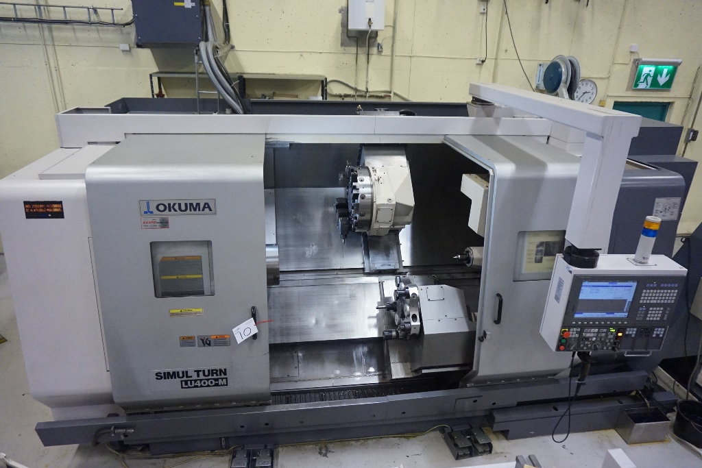 Okuma LU 400 M Simul Turn 5 Axis CNC Lathe fitted with OSP-200L CNC Control, Spindle Speed 38-3800rpm, Live Tooling Speed 30-3000 RPM, Axis Travels Upper Turret X Travel = 300mm Z Travel = 1275mm, Lower Turret X Travel = 195mm, Z Travel = 1270mm, C Axis 360 Degrees (0.001 Degree). Max Turning Dia 420mm, Max Turning Length 1250mm, Spindle Bore Dia 80mm, Swing Over Bed 650mm, Upper Turret 12 Station VDI 40 Tooling of which all can be driven, Lower Turret 10 Station VDI 40 Tooling fitted with a 12’’ Chuck, Tool Presetter, Tailstock with 150mm Quill Travel And MT5 Bore Taper, Swarf Conveyor, Machine Weight Approx. 12500kg. S/No 121634 (2006)