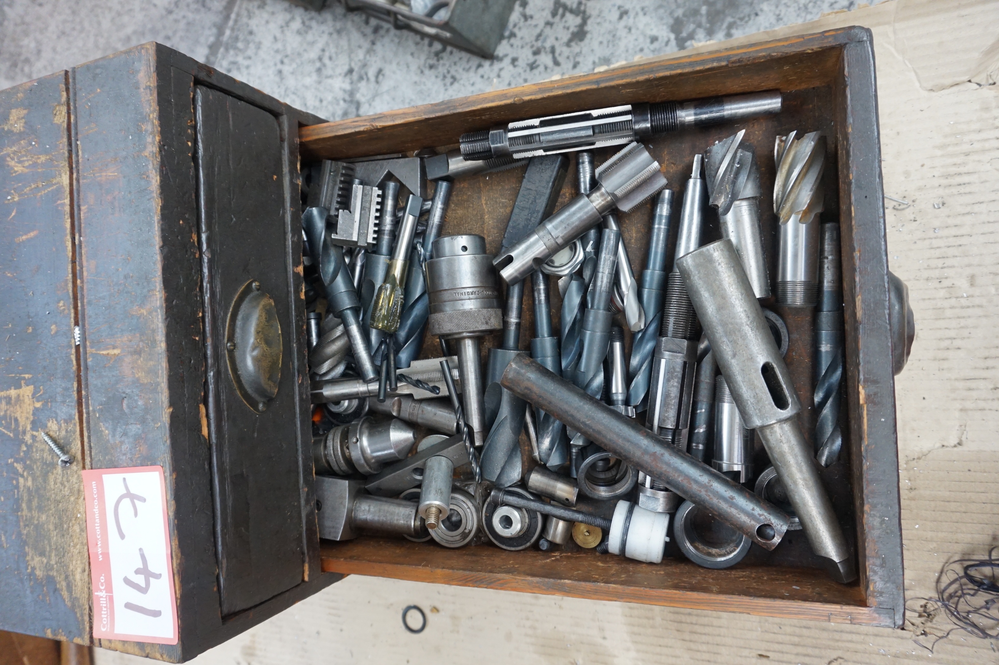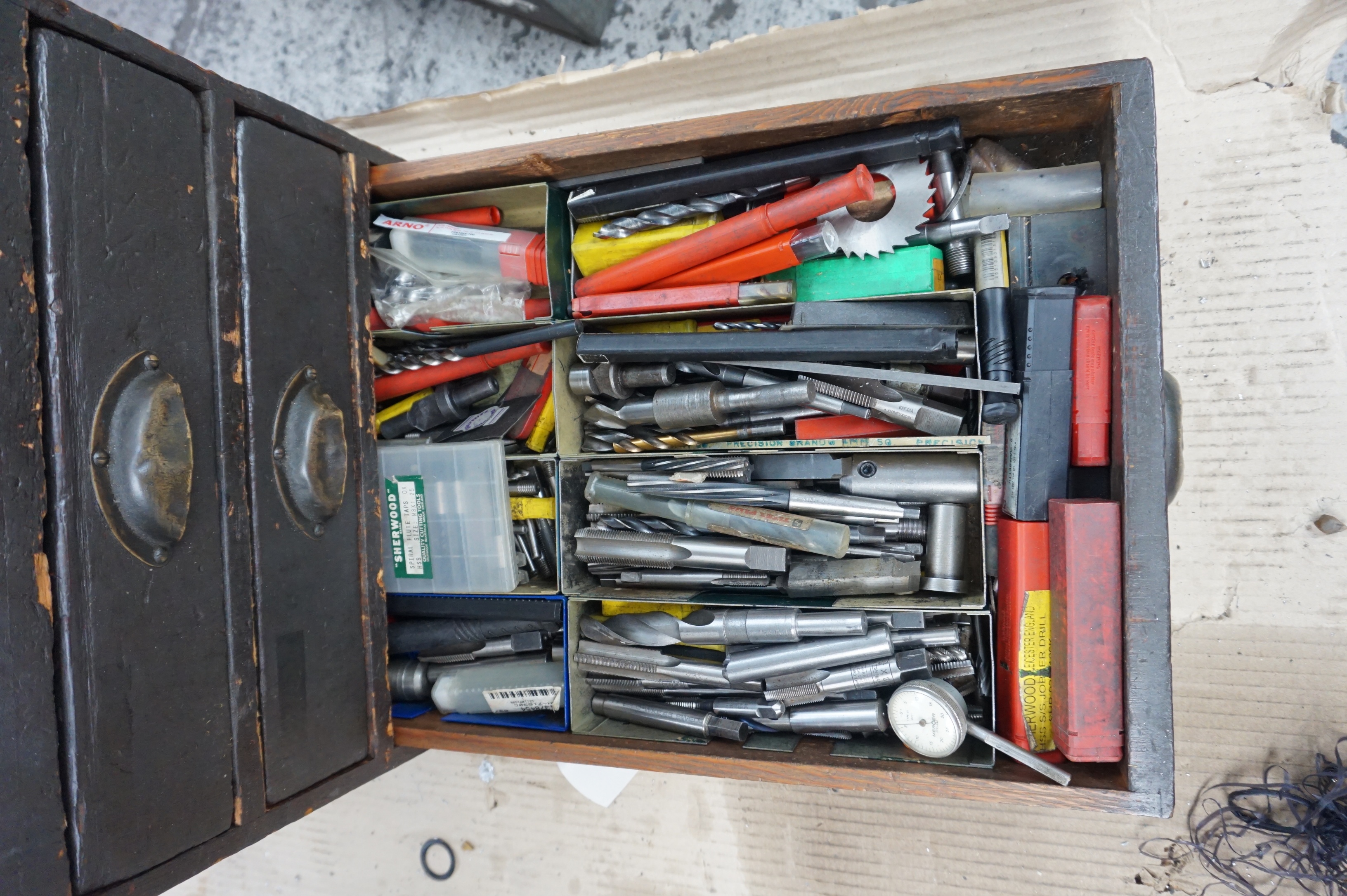 Wooden Cabinet including Drills Cutters, Reamers and Taps