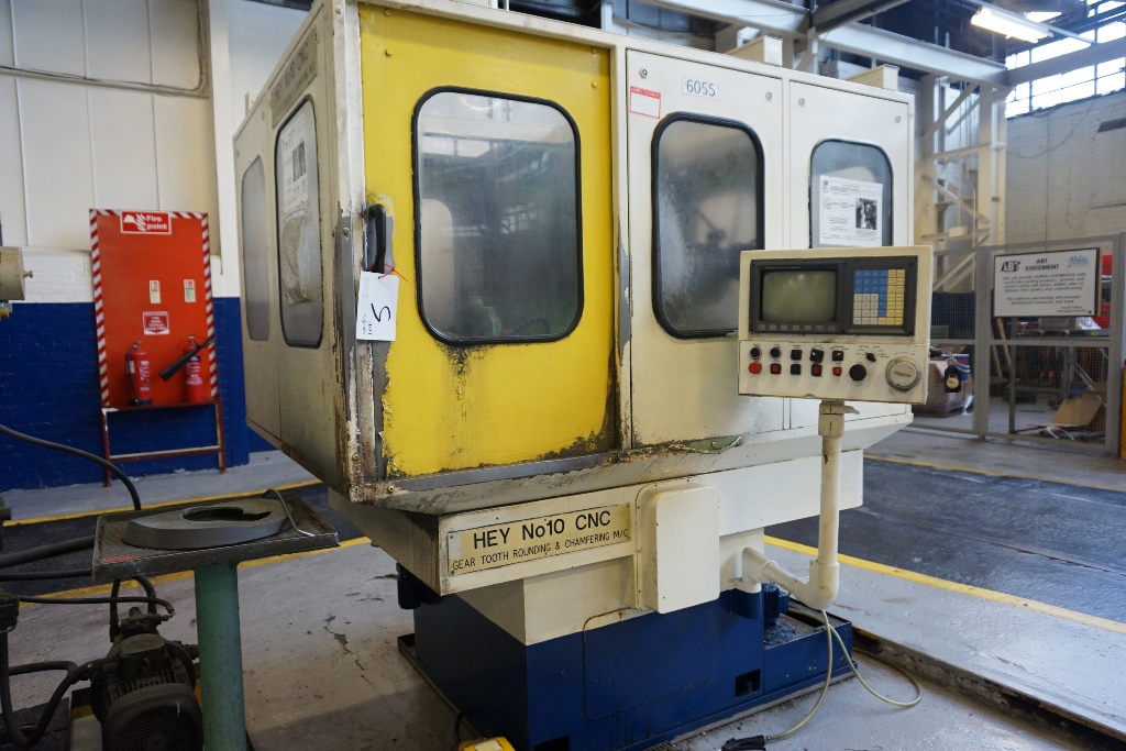 Hey No.10 CNC Gear Tooth Rounding Chamfering Machine Max with GE Fanuc Powermate Control, Work Dia: 250mm /10”, Max Worklength: 150mm / 8”, Max No Teeth: 160, Max Pitch: 6 MOD/4DP, Cutter Speeds: 2000-3000 RPM, Twin Parallel Adjustable Head, Clamping, Coolant, Magnetic Clarifier, S/No: 2814-877 (1995)