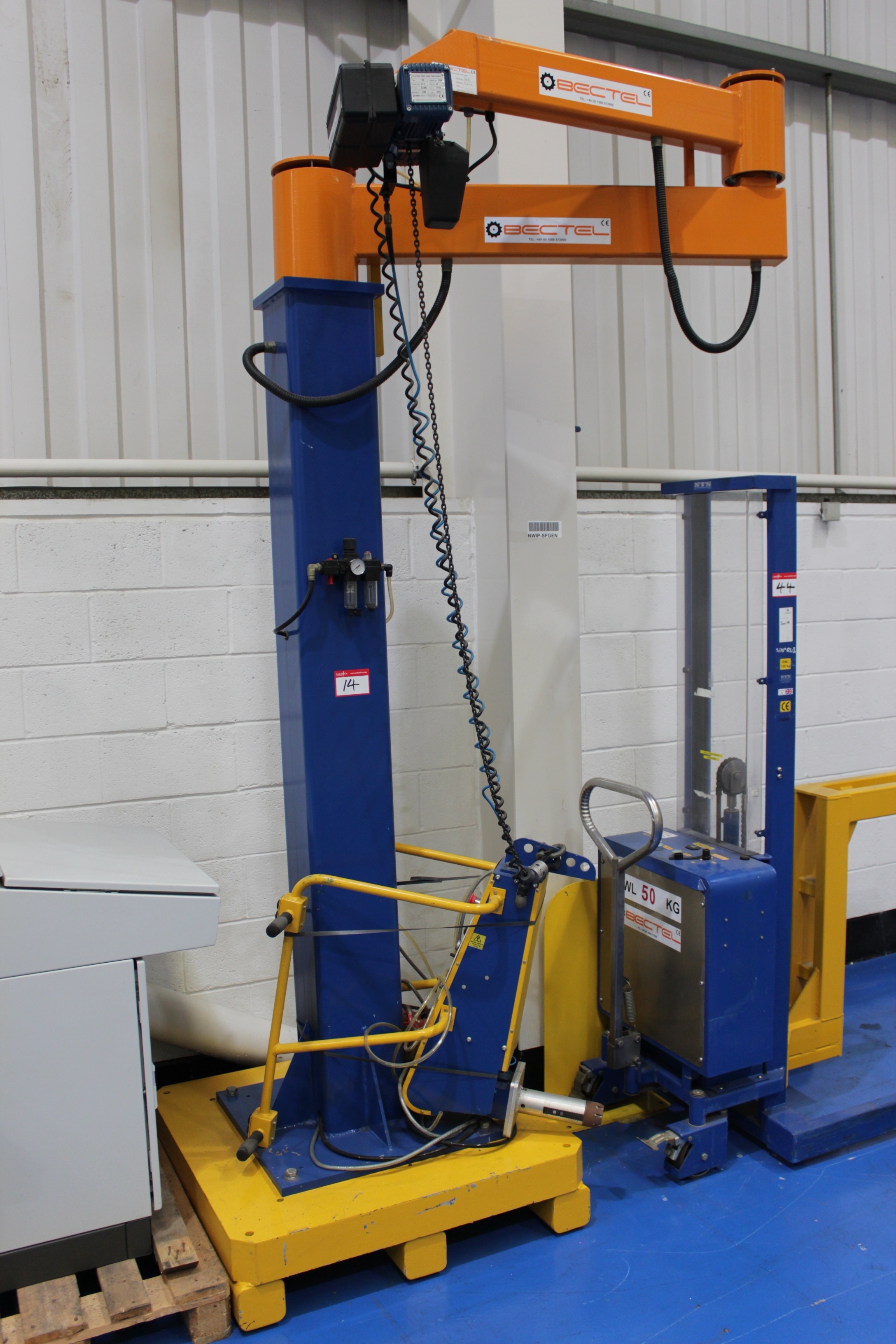 Bectel Articulated Floor Mounted Jib with 250kg SWL Electric Chain Hoist, Pneumatic Reel Lift