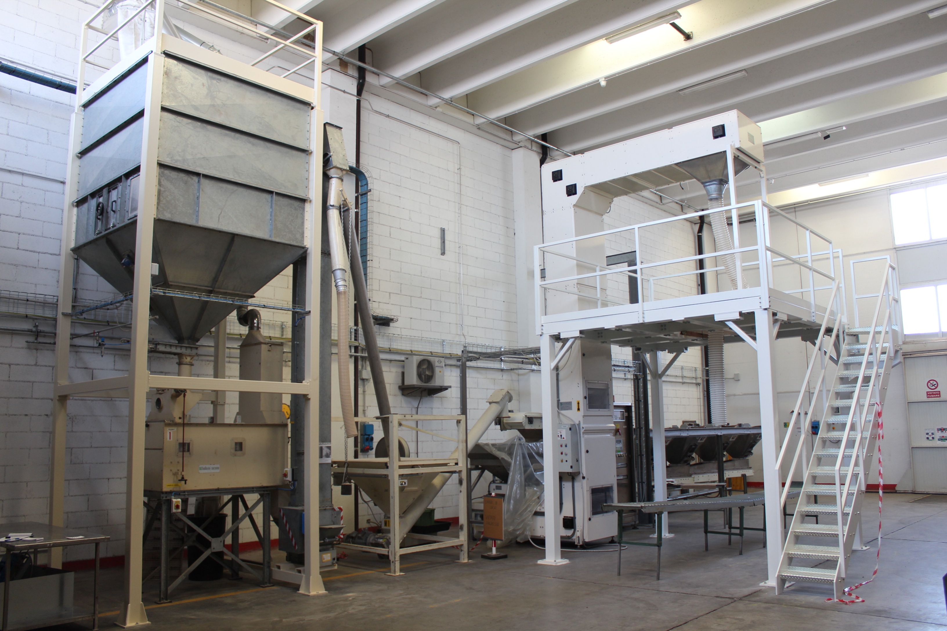 Ballarini Socama Type Settacio Screen with Overhead Bulk Feed Hopper and Bucket Elevator, Screw Feeded Vibratory Hopper, Cusinato ZJ660 Elevating Z Conveyor to Mezzanine Platform S/No. I50A0110, Falco Bucket Conveyor System S/No. 42198011 with 4 Sections Stainless Steel Hopper Blending Feed Systems each with Load Cells and Control Panel