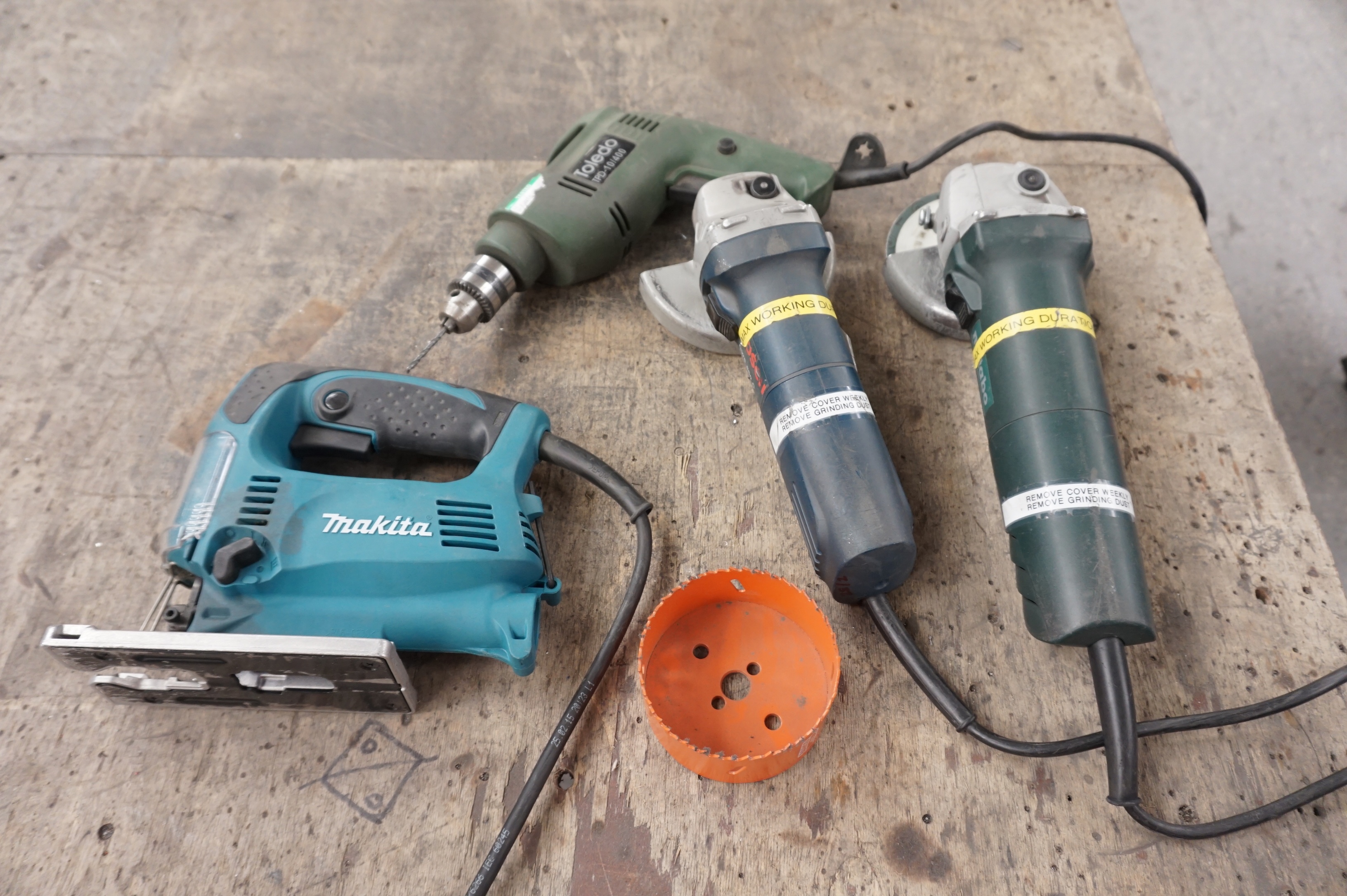 Qty of Power Tools including Makita Jigsaw, (2) Hand Held Grinders, Toledo Drill